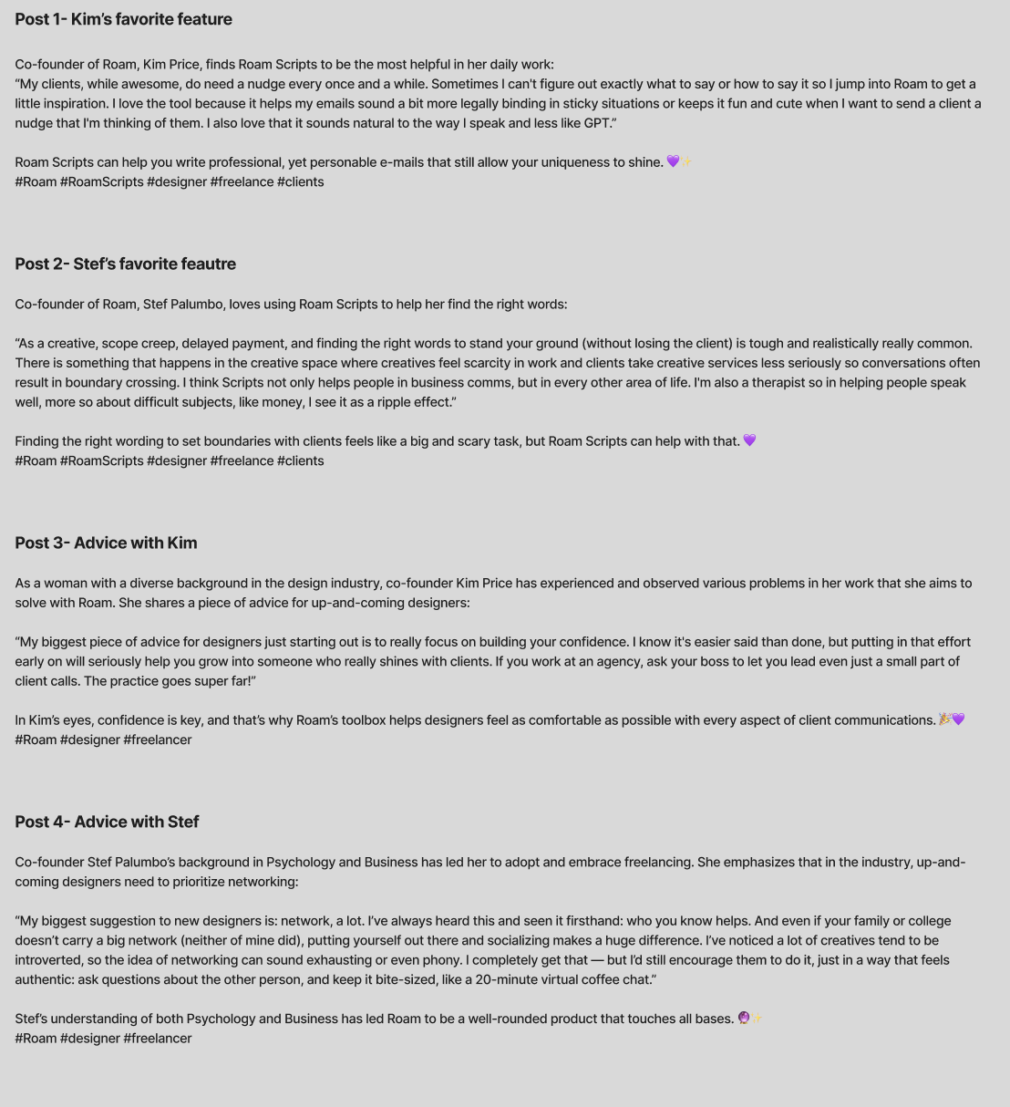 I conducted interviews with the founders of Roam and wrote LinkedIn posts for them to roll out. I wrote them with the intention of enforcing Roam’s brand ethos and building trust with clients.